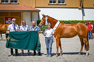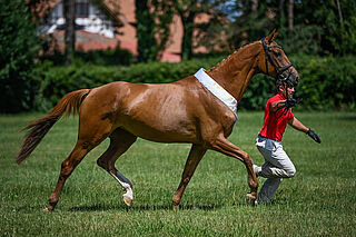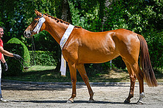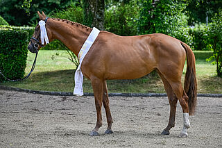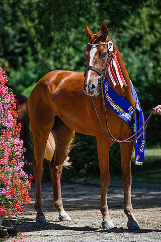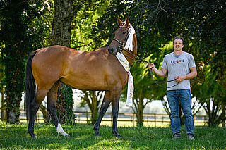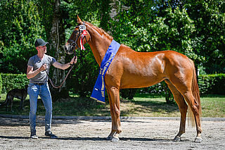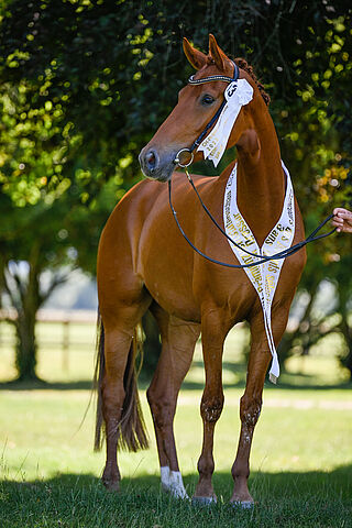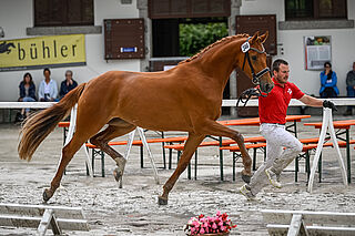 Trotzdem setze sich in diesem Jahr eine Aspirantin aus dem Dressurlage durch und holte sich den Titel «Miss Schweiz 2023». Pinja v. Schlossgut CH v. Morricone – Fürstenball – Gribaldi erhielt im Typ und im Gang die Maximalnote 10 von allen Richtern. Sehr gut liniert, harmonisch gebaut, mit einer optimal gelagerten Schulter, einer schönen oberen Linie, mit einem trockenen, korrekten Fundament und einem beeindruckenden weiblichen Charme lässt diese Stute bezüglich Zuchtzielmerkmalen keine Wünsche offen. Im Schritt taktvoll und raumgreifend, im Trab elastisch mit einer tollen Kadenz zeigte sie klar, in welcher Sparte des Sports man mit ihr rechnen kann. Sie widerlegte damit auch das oft gehörte Vorurteil, dass Fuchsstuten keine Schauen gewinnen können. Am Feldtest in Bern war sie von allen Teilnehmern das Pferd mit den höchsten Noten in den Grundgangarten. Züchterin und Besitzerin Ursula Aebischer aus Bösingen war sichtlich gerührt. Sehr verständlich, wenn man weiss, dass bereits die Mutter von Pinja, Paella v. Schlossgut den Titel «Miss Schweiz» im Jahr 2017 erringen konnte. Eine schöne Leistung und der Lohn für gut durchdachte züchterische Arbeit.