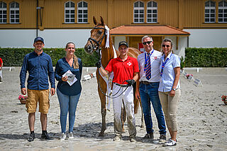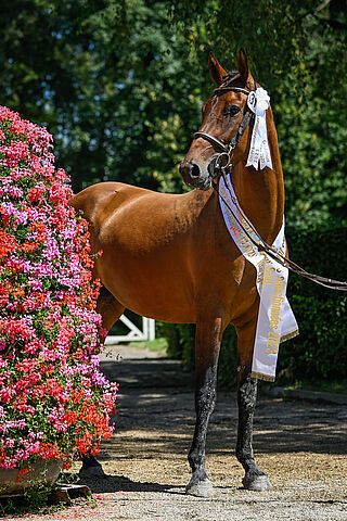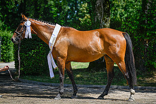Von allen 11 Teilnehmerinnen im Rappel hatte Caramba vom Eigen CH v. Check-in – Landino vom Eigen – Carabas den höchsten Veredlerblutanteil (18.75%) (Züchter und Besitzer: Urs Wiggli und Barbara Schnieper, Seewen SO). Sie wurde deshalb mit der roten Schärpe geehrt. Gut liniert, mit korrektem Fundament und taktvoll in der Bewegung – so zeigte sich diese Empfehlung für den Springsport in Avenches.