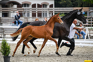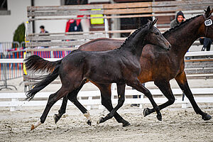 Siegerin bei den Stutfohlen Springen wurde die dunkelbraune Chiara V CH, eine Tochter des siebenjährigen Westfalenhengstes Comme Prévu, gezogen aus der CH-Prämienzuchtstute Quinta (Quality). Das Fohlen aus der Zucht von Hansruedi und Meia Bracher aus Alchenstorf begeisterte insbesondere durch seinen Trab und Galopp.
