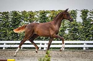 ACK Valoroso CH schwang bei den Hengstfohlen Springen obenaus. Eine super obere Linie und die gute Schulter wurden besonders hervorgehoben. Virtuoso Semilly ist sein Vater, die GB Scendix-Tochter ACK Bond Girl seine Mutter. Das Fohlen wurde gezüchtet von Salvatore und Esther Canino-Aeberhardt aus Kyburg-Buchegg.