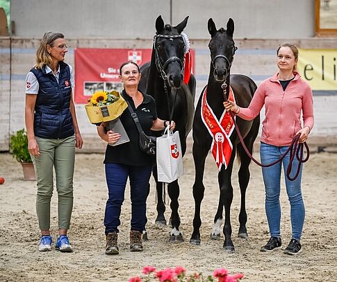 Kalani vom Loo CH (Moreno – Kumani vom Loo – Bretton Woods), heisst die Schönheit im dunklen Kleid aus der Zucht von Denise und Peter Luder, die mit 281 Punkten bei den Dressurstuten obenaus schwang. Sie verwies Eleischa CH (High Motion – Elodie – Hancock) von Barbara und Urs Wächter mit 278 Punkten und HZO Kalimba (Kjento – HZO Borsalina – Borsalino) von Vanessa und Denis Häfliger mit 276 Punkten auf die weiteren Plätze.