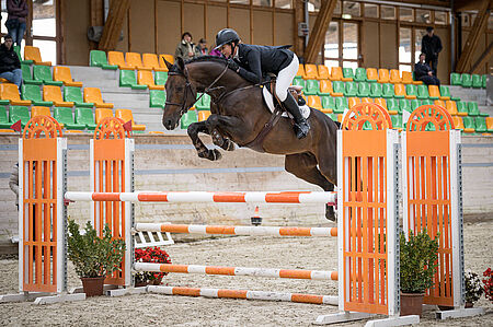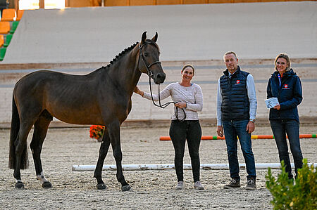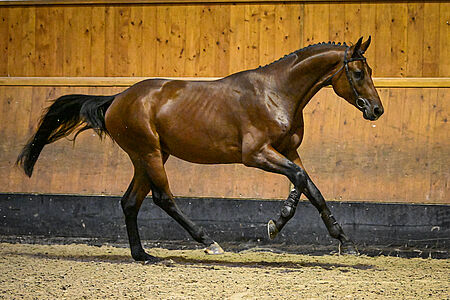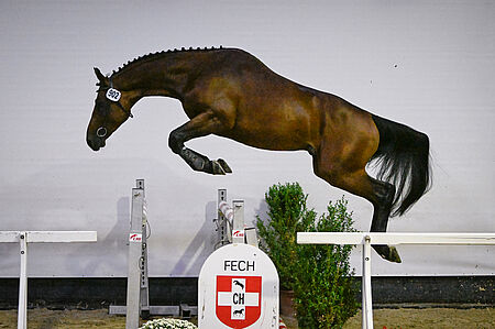 Anyway ist ein dreijähriger, bereits gut entwickelter, moderner, brauner Sohn von A la Carte NRW, gezogen aus der Holsteiner Stute Emily (Favoritas xx – Come on – Romino) von Uwe Tiemann, D-Drage. Besitzerin ist D’Aveline Sport- und Zuchtpferde AG, Evelyne Bussmann & Rudolf Sigg, Kirchberg BE. Anyway, mit guter Bewegung ausgestattet, zeigte sich im Freispringen und bei der Sattelsichtung überzeugend.