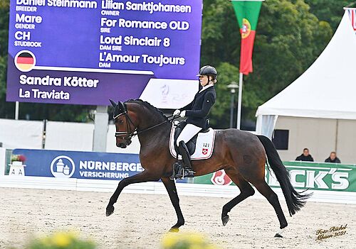 An der WM Junge Pferde Dressur konnte sich die Stute La Traviata v. For Romance – Lord Sinclair aus der Zucht von Daniel Steinmann, Rüti ZH für das Finale der besten 5jährigen Pferde mit einem Resultat von 90.4% qualifizieren. Dort erreichte sie gegen ausserordentlich starke Konkurrenz, die vor allem von der europäischen Elite der Dressurhengste dominiert wurde, mit ihrer deutschen Reiterin Sandra Kötter den tollen 12. Rang mit 83.2%. In der Qualifikation erhielt sie im Trab mit 9.8 die Bestnote aller Pferde in der Prüfung. Im Finale bescheinigten der ehrgeizigen Stuten die Kommentatoren eine aussergewöhnliche Schubkraft, ein schönes Gleichmass in der Bewegung aus der Nachhand und vor allem ein sehr aktives Hinterbein. La Traviata wurde als Fohlen über die VSS-Fohlenauktion an ihre heutige Besitzerin Lilian Sanktjohanser (Deutschland) verkauft.